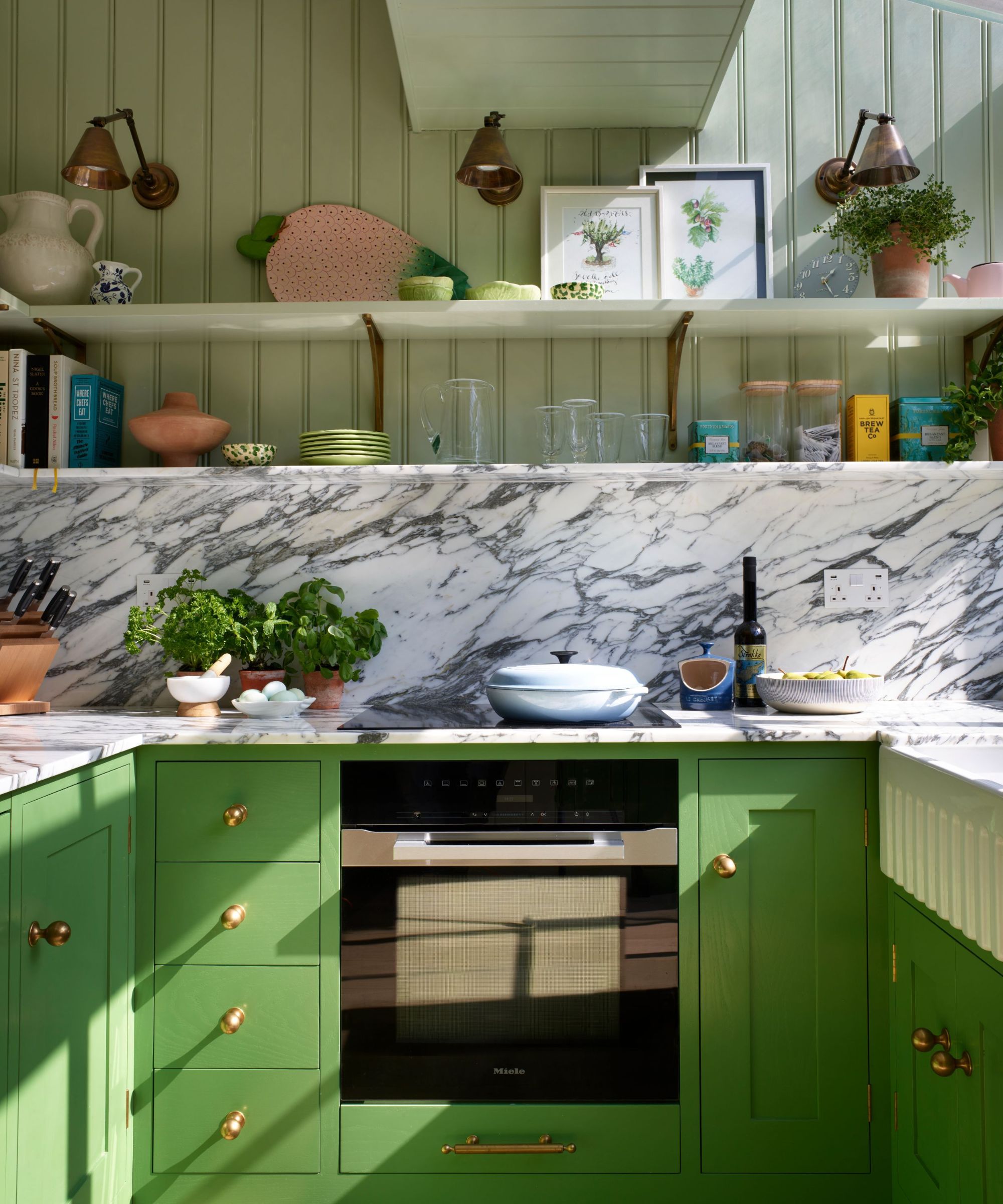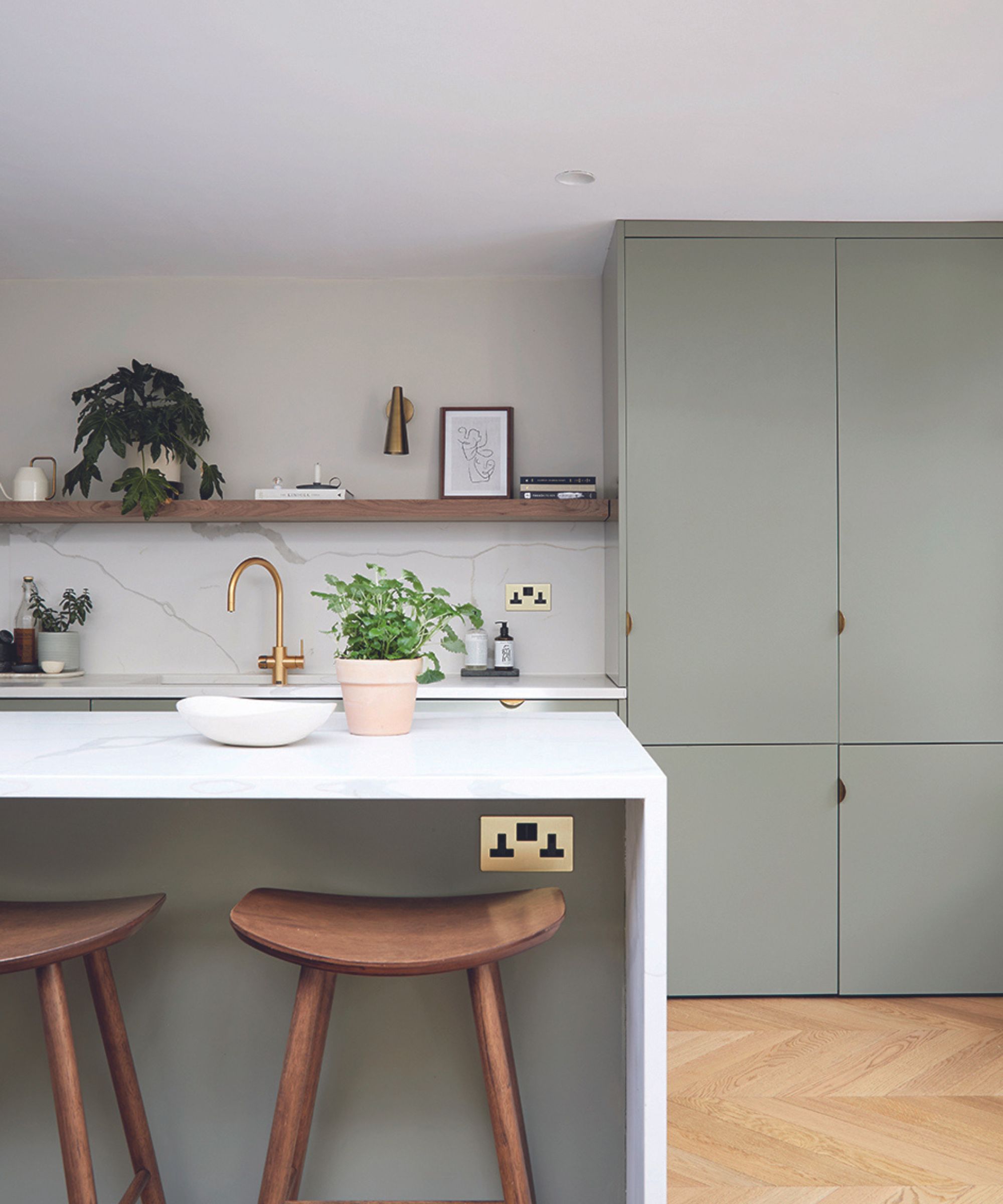And mixing decor with functional kitchenware is key. ‘We often use open shelving to display items that are both functional and attractive – stacks of serving platters, glassware, wooden boards, or ceramic bowls. It’s also a wonderful opportunity to layer in art, plants, and small objects so the room feels collected and personal rather than purely utilitarian,’ she explains.